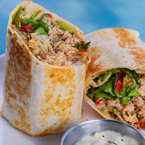 Burrito relleno de pollo, carne de res, queso mozzarella, pico de gallo y lechuga, acompanado de aderezo de mayonesa picante.