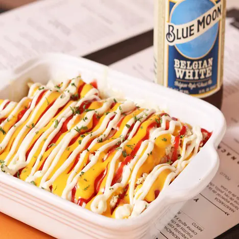 Cama de papas fritas o platano maduro con carne de res molida con queso mozarella derretido, aderezado con queso fundido, mayonesa y ketchup.
